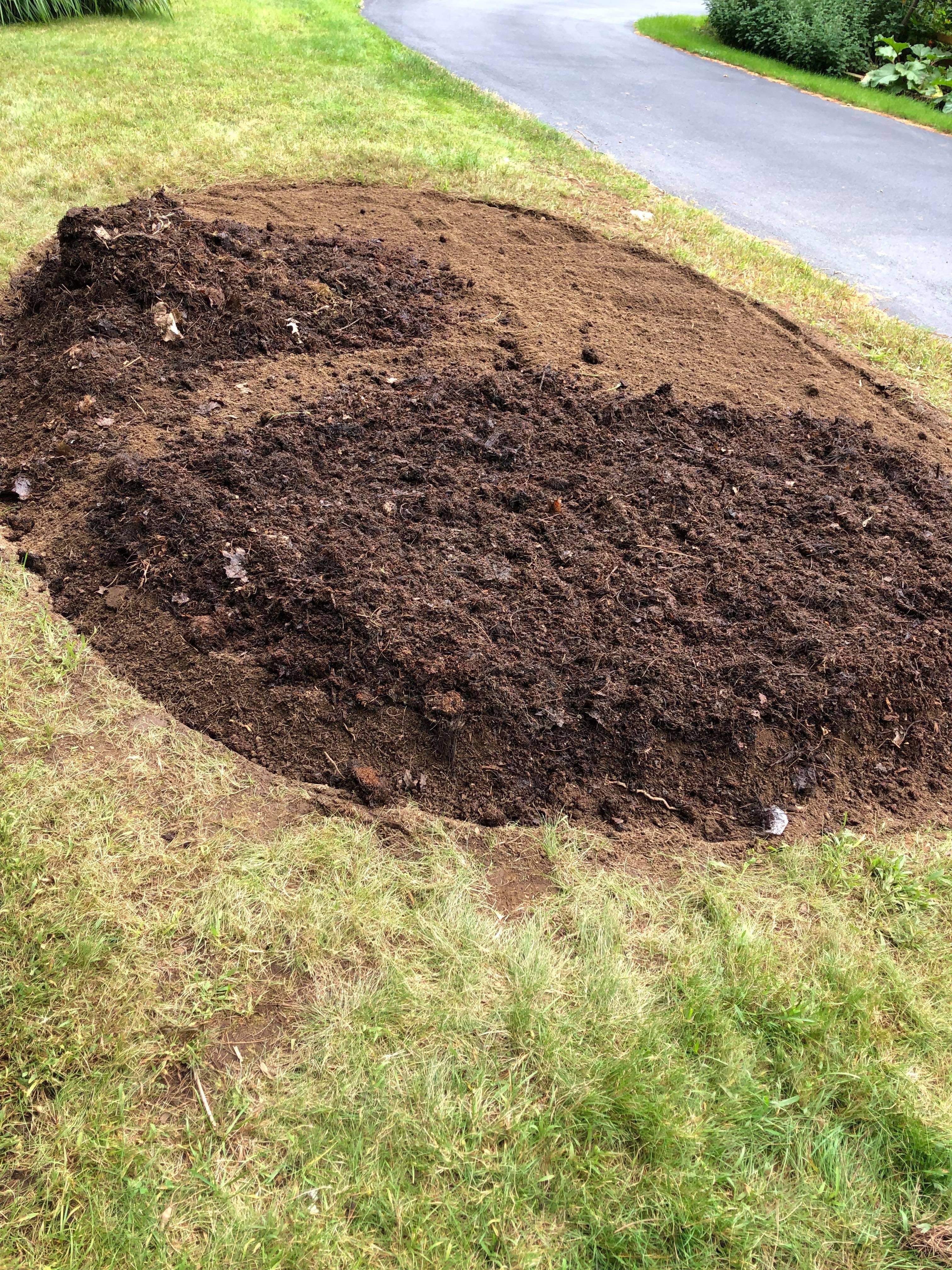 The soil left after removing the plants was full of daylilly tubers, rocks, roots and weeds so I set out to sift the soil. That was a lot of work but well worth it as I took three and a half wheel barrow loads out. What I discovered upon removing the soil was my perennial nemesis in gardening here at the top of a rocky ridge, ledge. So I dug out my father in law Dan Smith’s small sledge and stone chisel. After removing some, but not all of the offending rock I thought of the saying, ”Perfect is the enemy of good.” So I decided that the future plants would just have to grow around the remaining rock.